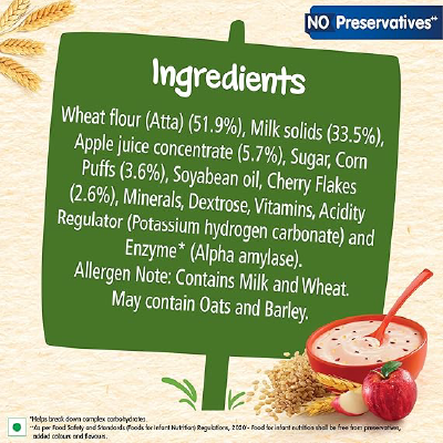 Nestlé CERELAC Wheat Apple Cherry is a complementary baby food for infants from 8 to 24 months. 2 serves of CERELAC Wheat Apple Cherry Cereal provide 37% of a baby’s daily need^ of iron. It is also a source of 14 important nutrients including vitamins and minerals. This baby food cereal is rich in protein and packed with the goodness of cereal, milk, and fruits. With 155 years of scientific expertise in infant nutrition, Nestlé develops infant nutrition products backed by evolving science and research. Innovation has been at the heart of Nestlé since its beginning. Storage Instructions: After opening the pack, the contents should immediately be transferred to an empty, clean, dry and airtight container. After each use, replace lid tightly & store in a cool,dry and hygenic place. Important Notice: Mother’s milk is best for your baby. ^Basic Recommended Dietary Allowance, ICMR 2020 & Recommended Nutrient Intake by WHO/FAO for a 6-12 month or 1-3 year old child.Ensure enclosed scoop is thoroughly washed and dried before use. After opening, use the contents within 3 weeks or the expiry date, whichever is earlier. Important Notice:Mother’s milk is best for your baby. Safety Warnings: Infant food should be used only on the advice of a health worker as to the need for its use and the proper method of its use. Infant food is not the sole source of nourishment for an infant. Use prepared feed within half an hour otherwise microbial deterioration may set in. Discard unused feed.