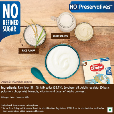 Nestlé CERELAC Rice with No Refined Sugar is a complementary baby food for infants from 6 to 24 months. It is also a source of 15 important nutrients including vitamins and minerals. With Iron, Protein, Calcium, ALA (Omega 3) & Vitamin D. This baby food cereal is packed with the goodness of cereal and milk.With 155 years of scientific expertise in infant nutrition, Nestlé develops infant nutrition products backed by evolving science and research. Innovation has been at the heart of Nestlé since its beginning. Contains no Refined Sugar. Storage Instructions: Store unopened pack in a cool and dry place.After opening ,use the contents within 3 weeks or the expiry date, whichever is earlier. Prolonged storage and exposure to air may result in infestation & off odors & taste. On opening, transfer the contents of the pack along with the pouch into a clean airtight container. After each use, close lid tightly and store in a cool, dry and hygienic place.Important Notice: Mother’s milk is best for your baby. Warning/Caution : Careful and hygienic preparation of infant food is most essential for health. Do not use fewer scoops than directed since diluted feeding will not provide adequate nutrients needed by your infant.Do not use more scoops than directed since concentrated feed will not provide the water needed by your infant. Infant food shall be only used on the advice of a health worker as to the need for its use and the proper method of its use Safety warning: Infant food is not the sole source of nourishment of an infant. Boiled and cooled water shall be used to prepare this product and any leftover product must be discarded to reduce the risk of infection.Use prepared feed within half an hour otherwise microbial deterioration may set in.Discard unused feed. The scoop provided with this pack should be thoroughly washed and dried before use. Allergen note: Contains Milk.