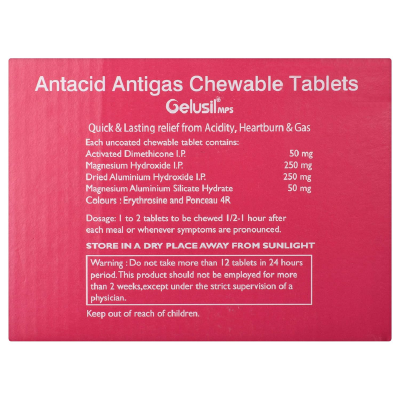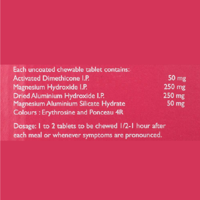 Composition: Each uncoated chewable tablet contains: Activated Dimethicone I.P.50 mg. Magnesium Hydroxide I.P. 250 mg. Dried Aluminium Hydroxide I.P. 250 mg. Magnesium Aluminium Silicate Hydrate 50 mg. Colours : Erythrosine and Ponceau 4R