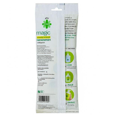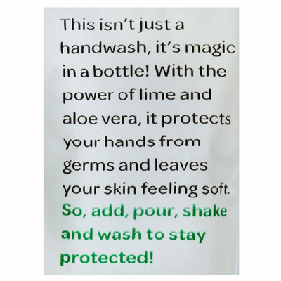 The first-ever powder to liquid handwash, gentle on skin, but tough on germs with lime and aloe vera, easy to make, in just 3 steps make 200 ml of handwash with 1 refill sachet.