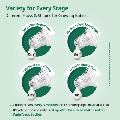 The LuvLap Natura Flo teats are 100% Liquid Silicone and have an anti-colic valve that vents air into the bottle, preventing any air from entering the baby’s tummy. The teats are 100% Liquid Silicone and have an anti-colic valve that vents air into the bottle, preventing any air from entering the baby’s tummy. The teat has grooves at the tip, which encourage peristaltic suckling, while the wide base helps the baby get a natural latch, similar to that on the mother’s breast. This helps easy transition between breastfeeding & bottle feeding. The grooved teats and superior silicone quality ensure no nipple collapse, helping in an uninterrupted feed.