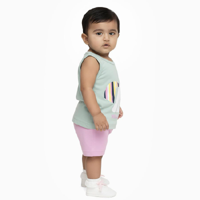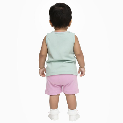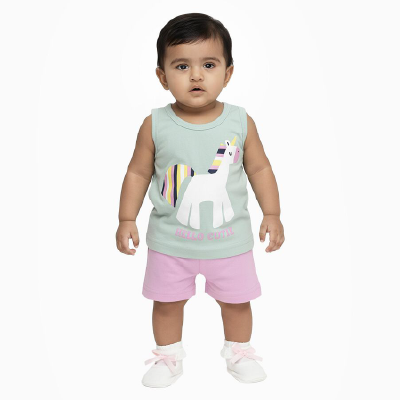 This Soft Mint Green Sleeveless Top-and-Shorts Set in breathable cotton keeps your little one comfortable and stylish. The top features a playful unicorn graphic print, while the shorts offer a relaxed fit. Perfect for casual outings or lounging at home. Pair with cute sandals or sneakers for a complete look.