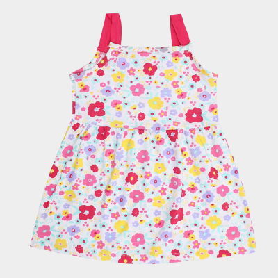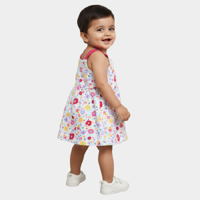 This White Floral Print Cotton Frock is crafted in breathable cotton for ultimate comfort. Featuring a vibrant multicolored floral design and bold pink straps, it is perfect for summer outings or casual wear. The sleeveless A-line silhouette ensures ease of movement. Pair with sandals for a cheerful look.